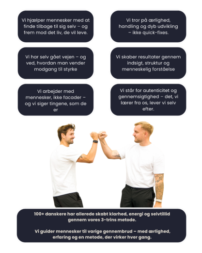 Gennem erfaring, fejl og personlig udvikling fandt vi en vej tilbage til et liv med mening, energi og frihed. I dag hjælper vi andre med at gøre det samme – uden unødvendig teori, men med ærlige værktøjer, der virker i virkeligheden.