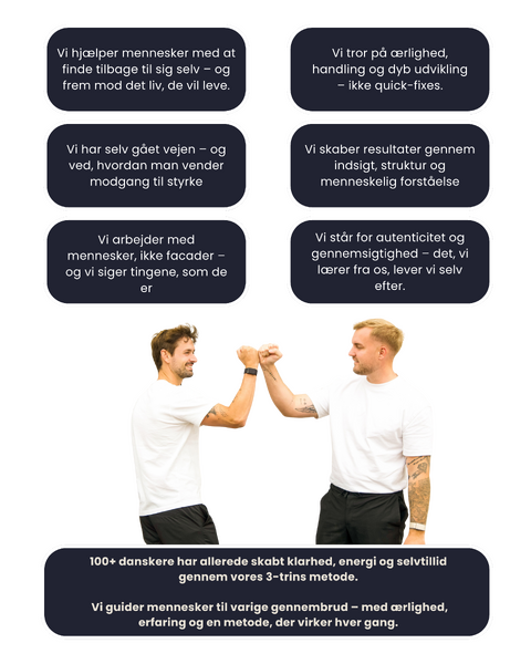 Gennem erfaring, fejl og personlig udvikling fandt vi en vej tilbage til et liv med mening, energi og frihed. I dag hjælper vi andre med at gøre det samme – uden unødvendig teori, men med ærlige værktøjer, der virker i virkeligheden.